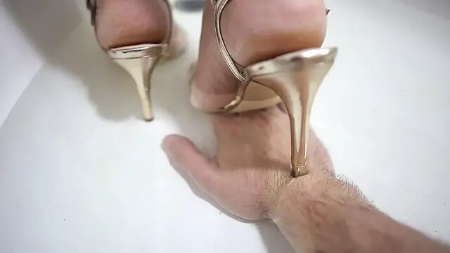 The girl steps on the slave's hands in the bathtub in the water and leaves marks on his hands